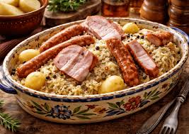 Traditionnellement, elle est accompagnée d’une grande variété de charcuteries : saucisses, lard, jambonneau ou encore viande fumée viennent compléter ce plat copieux et savoureux. L’ensemble offre un équilibre entre l’acidité du chou et la richesse des viandes, créant une expérience gustative unique.